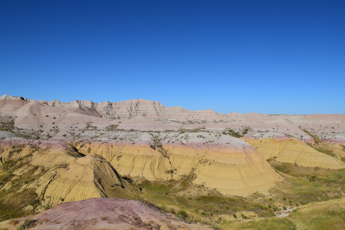 After fast tracking it through Minnesota and most of South Dakota (and after lots of time on I90!), we finally made it to the Badlands! The Badlands was our introduction to the amazing world of parks in the Western part of the United States. For those of you unfamiliar with the Badlands, the geology of this park is the big draw- striations of grey intermixed with yellow, purple, and pink, hues that you would normally associate with a sunset, not rocks. The park is a process of deposition and erosion, meaning that the various layers were slowly deposited over time (the earliest layers are estimated to be between 69 and 75 million years old), and in the last 500,000 years they are being eroded away. Water is largely responsible for the formation of this area (whether it was the inland sea that once covered the area or flooding rivers that brought some of the other layers in) as well as its erosion. Since we visited at the end of August, in the heart of summer, when the sun blazes all day and with highs between 90 and 105, it’s hard to imagine water in a place so hot and dry.